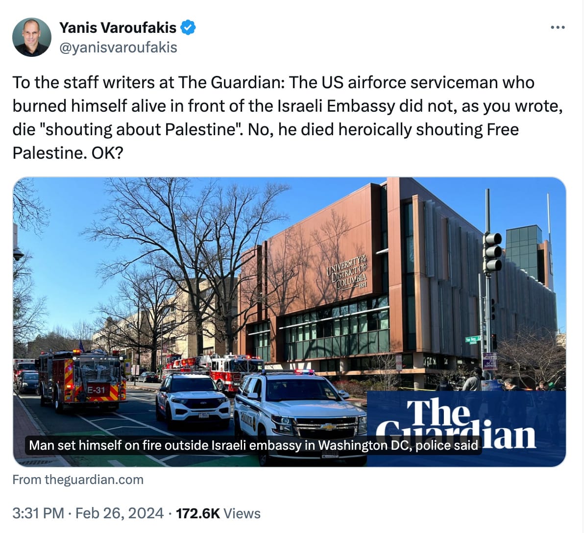 In one Guardian article, the staff journalists wrote Aaron was “shouting about Palestine” as he set himself on fire. The article was amended after Twitter users, including Greek politician, Yanis Varoufakis, criticised them.